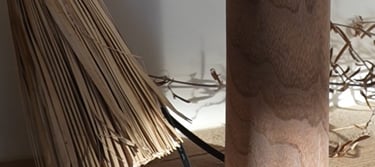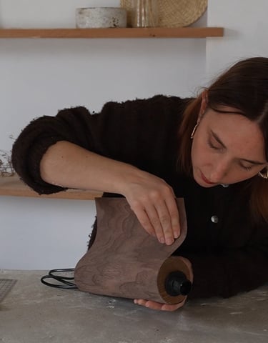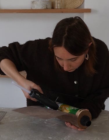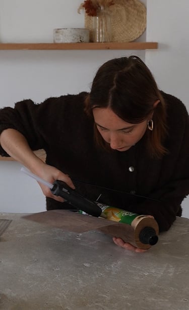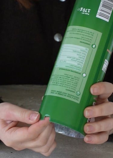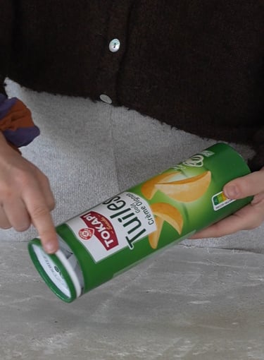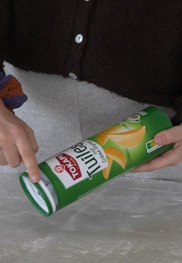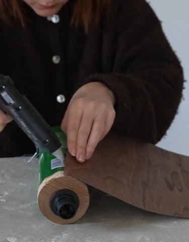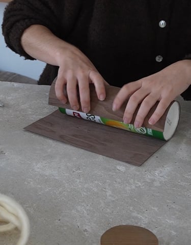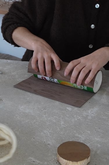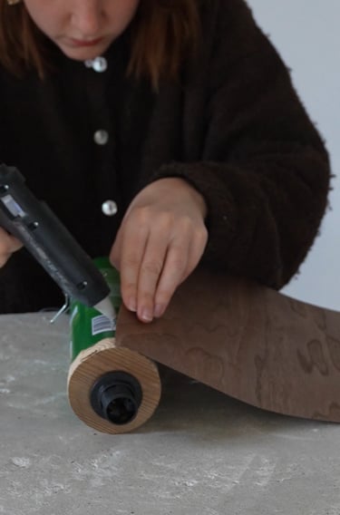 Après avoir coller le cercle de bois sur notre paquet de chips à l'aide de colle chaude et la douille de la même manière sur le cercle de bois, on enroule le placage sur le tube de carton et on vient réaliser des bandes de colle chaude à intervalles réguliers pour le maintenir en place. N'oubliez pas de porter des gants pour cette étapes, je ne l'ai pas fait et je l'ai amèrement regretté (C'est plus chaud que ce qu'on pense, même au travers du placage !!)