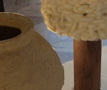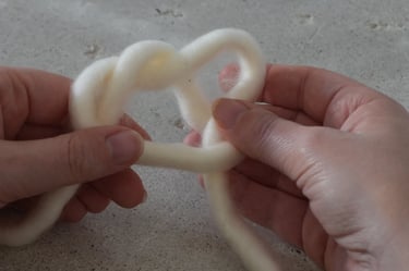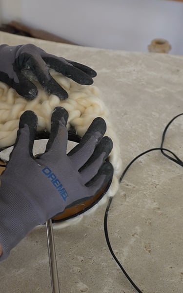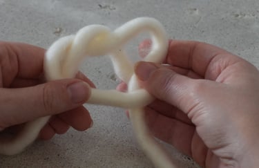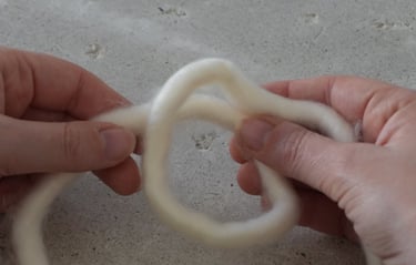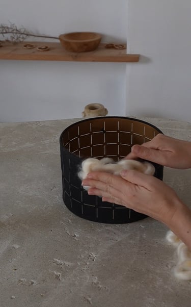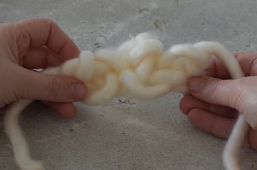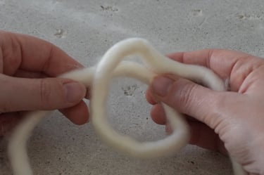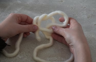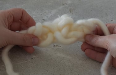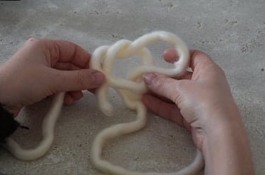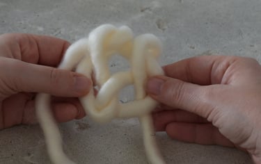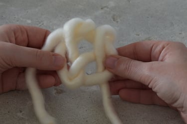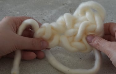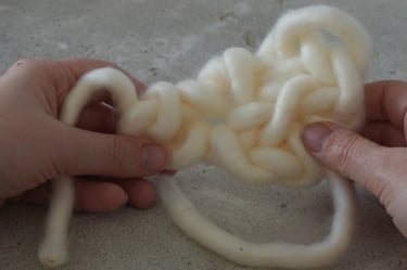 Ensuite je prends de la laine très épaisse et je commence à réaliser des noeuds de manière aléatoire, je fais une boucle, je passe dessus, dedans, parfois je ressors plus loins ou j'enroule plusieurs fois mon fils autour de la forme déjà créée ! Le but est d'arriver à une sorte de petit tapis de laine bien plat avec un design aléatoire. Une fois que je me sens bloquée et que je ne sais plus comment continuer mon oeuvre, je coupe le fil.