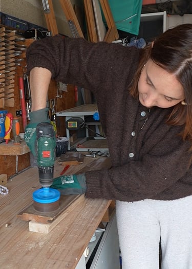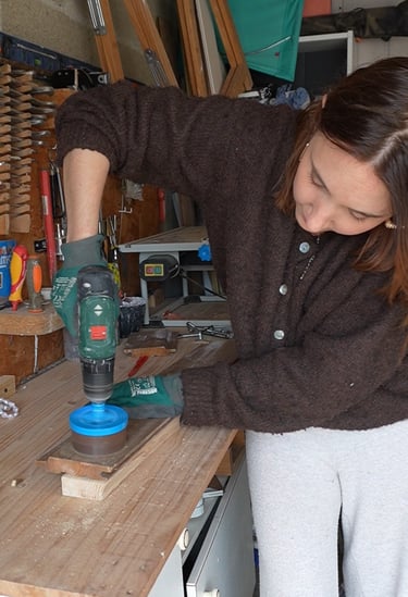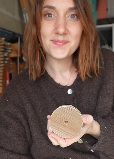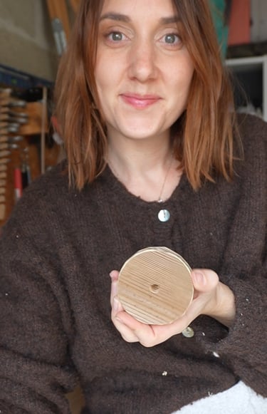 Je suis venu découper dans une vieille planche un cercle de bois à l'aide d'une scie cloche afin de refermer ma boite de chips. Pour être honnête cette étape n'est pas indispensable car au final ce morceau de bois ne se voit pas du tout. Pour fair plus on aurait pu tout simplement utiliser le couvercle du paquet ! Je perce le centre de mon cercle avec une meche à bois du diamètre de ma future douille.