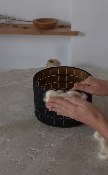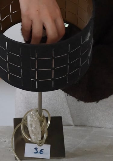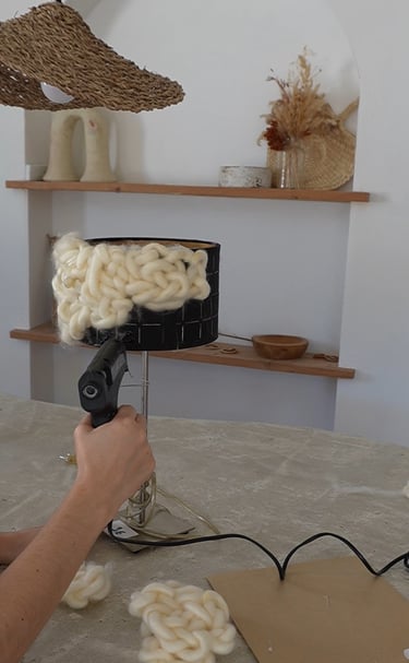 Je viens coller les petits tapis que j'ai obtenu sur l'abats jour de ma lampe. Au fur et à mesure, j'essaye d'adapter les futurs petits tapis pour qu'ils aient à peu près la forme dont j'ai besoin pour compléter mon abat jour. Enfin je m'assure que mon abat jour soit totalement couvert. S'il y a des petites espaces non couvert, j'utilise ma colle pour rapprocher les fils de chaque côté et combler les espaces