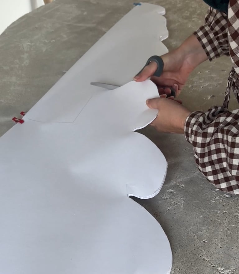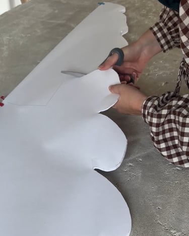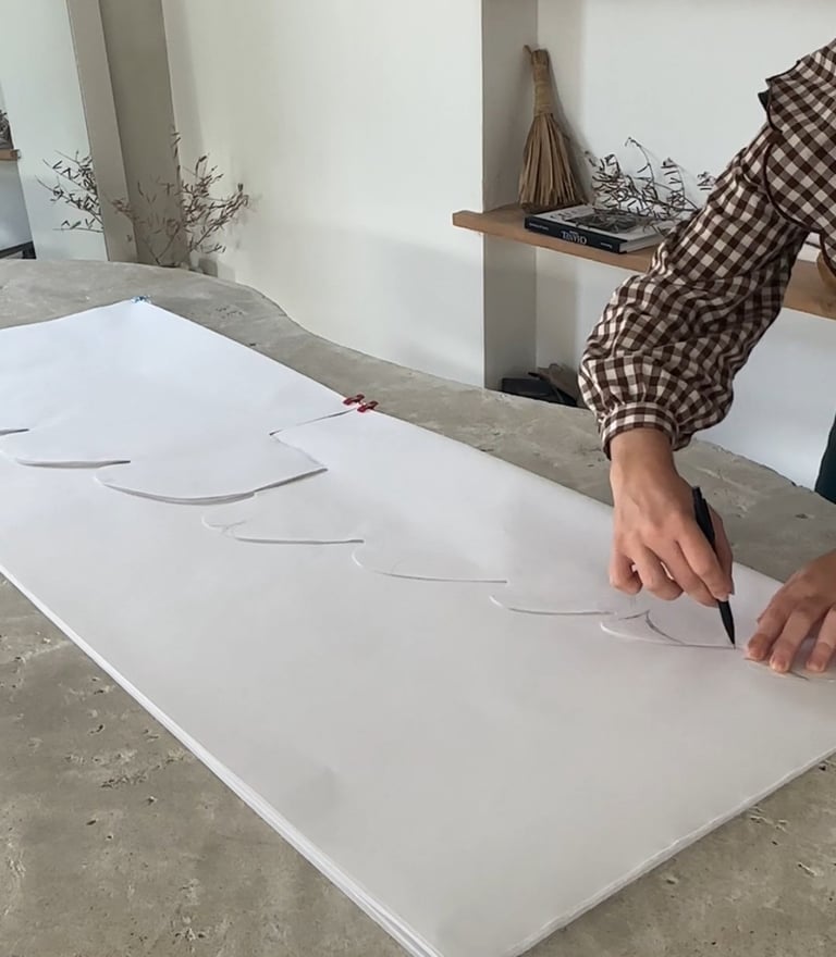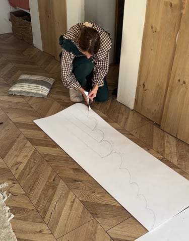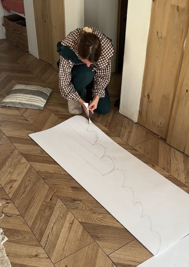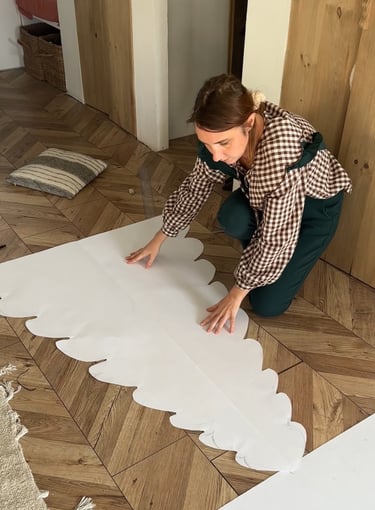 Je plie mon morceau en deux dans la largeur, pour pouvoir dessiner la moitié du sapin et le découper en une seule fois afin qu'il soit bien symétrique. On découpe directement à travers les deux épaisseurs de papier. Quand on ouvre la feuille, tadaaa : on a un sapin complet ! Je découpe l'intégralité de mon rouleau en lés de 140 cm en utilisant la même technique que précédemment.