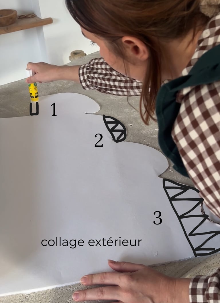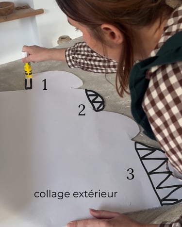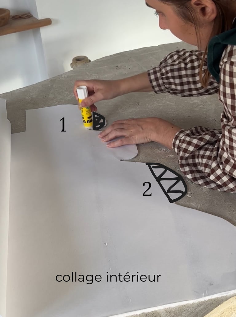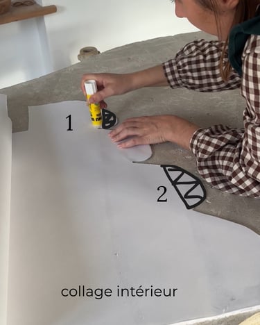 Je vais coller les lés entre elles puis les deux faces du papier plié entres elles. J'appelle le premier collage : collage extérieur et le second collage intérieur puisqu'il correspond au collage à l'intérieur de mon papier plié.