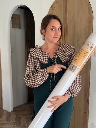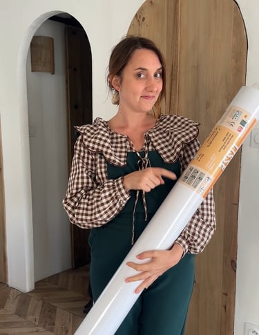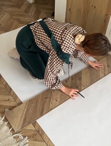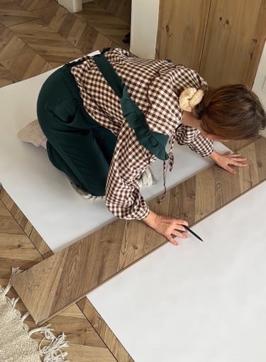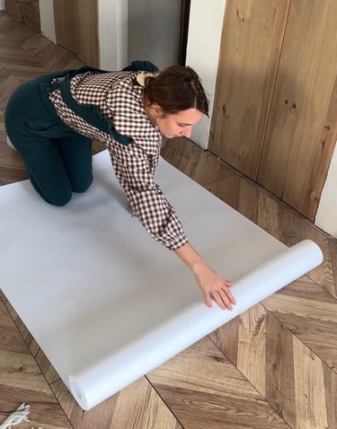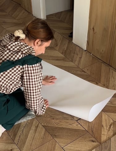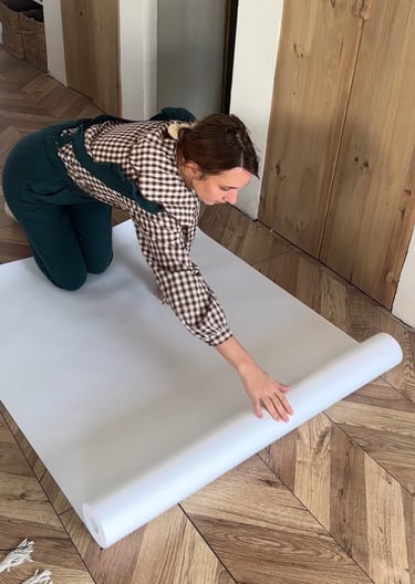 On commence par découper dans notre rouleau un morceau 140 cm de long. Pour ça j'ai utilisé un chute de parquet (mais une règle ou quoi que ce soit de droit et de plus long que notre rouleau fera l'affaire) que j'ai posé à l'endroit que je souhaite. J'ai marché sur ma planche et je suis venu déchirer mon papier le long de celle-ci.