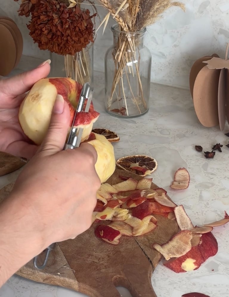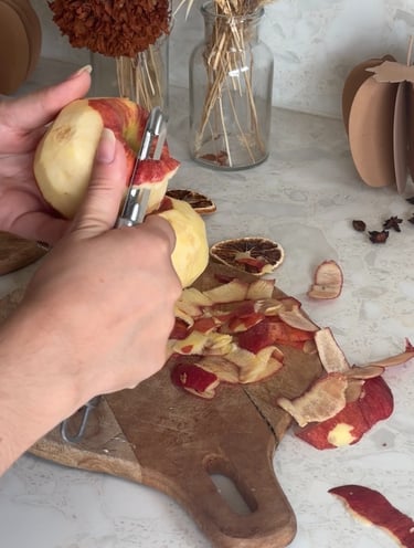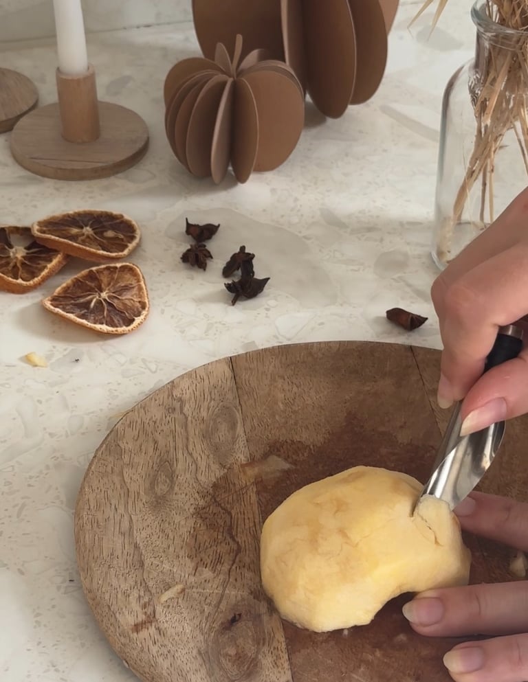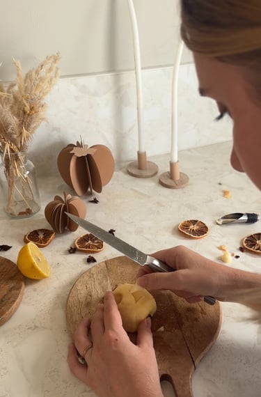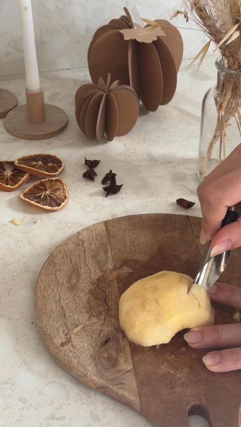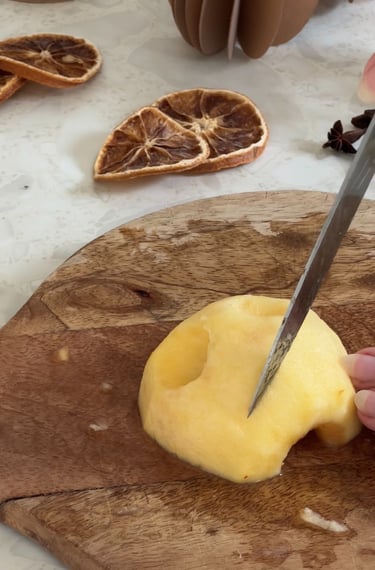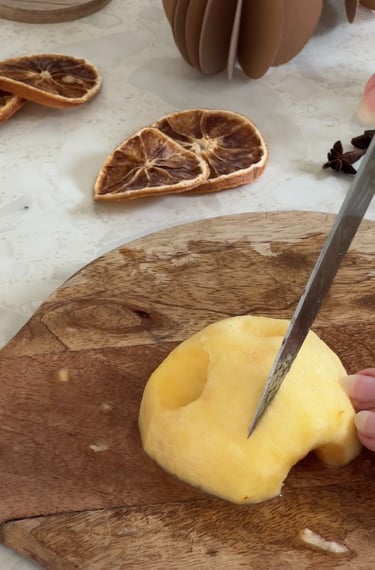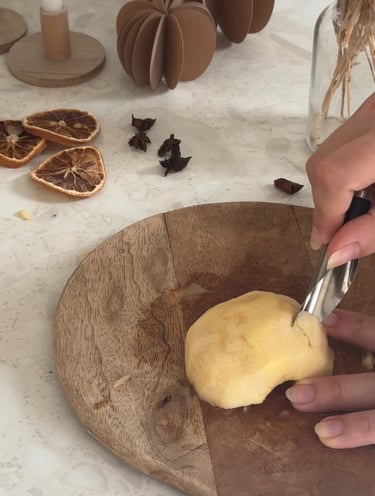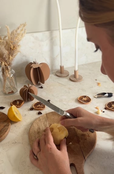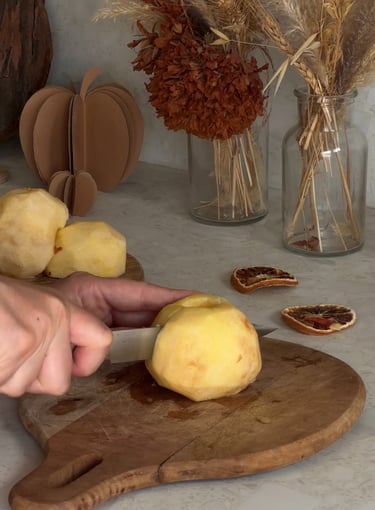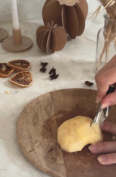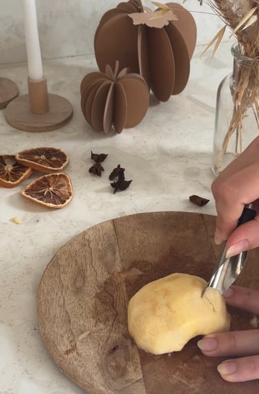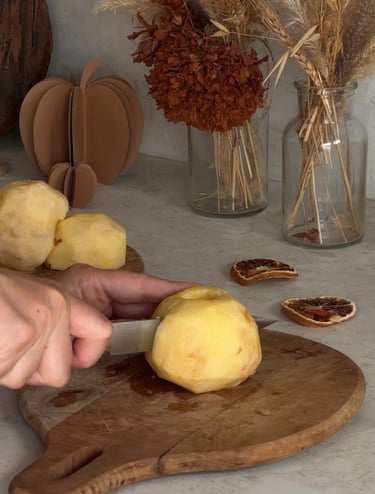 On commence par préchauffer le four à 90°, puis on pèle et on coupe les pommes en deux.