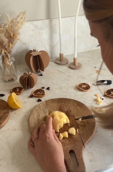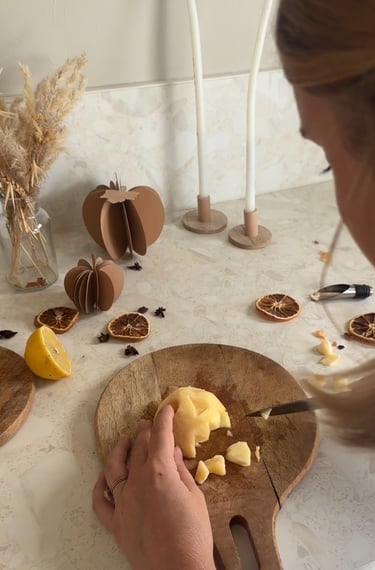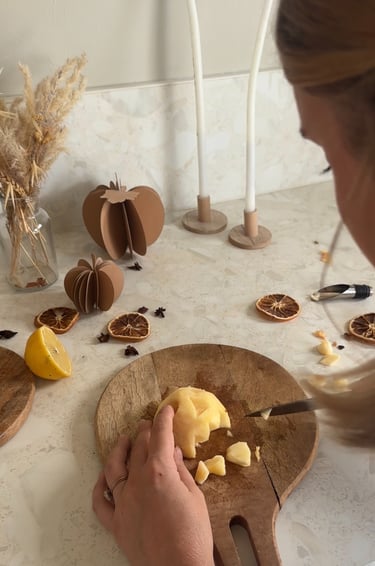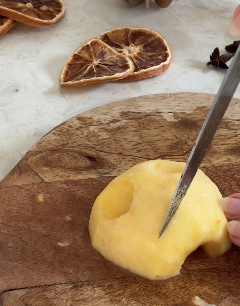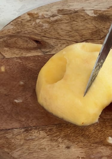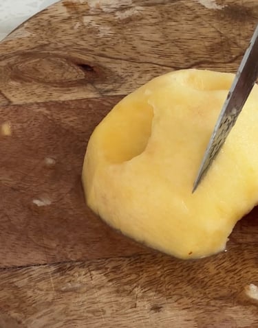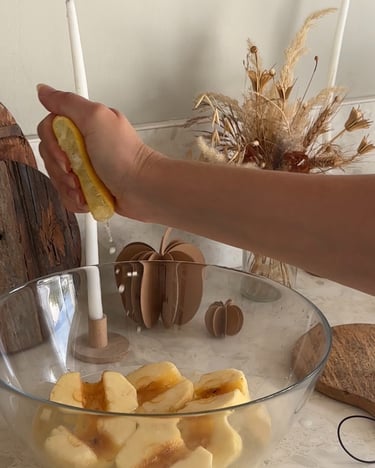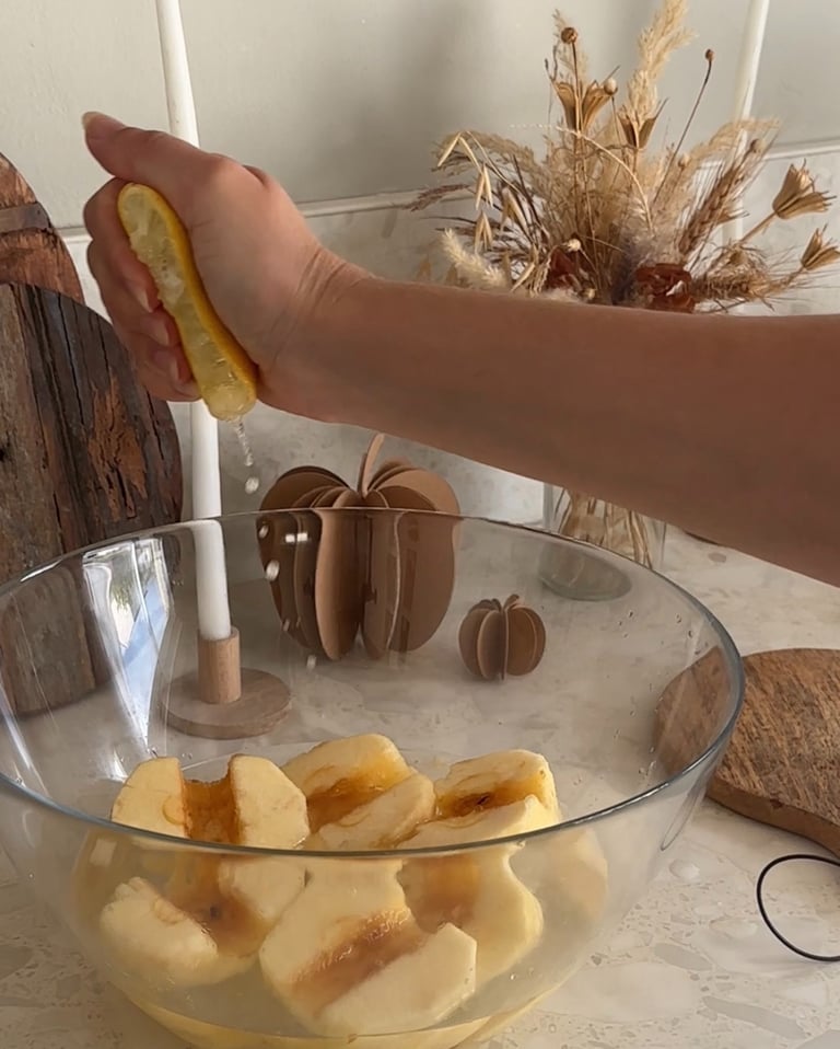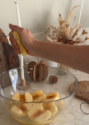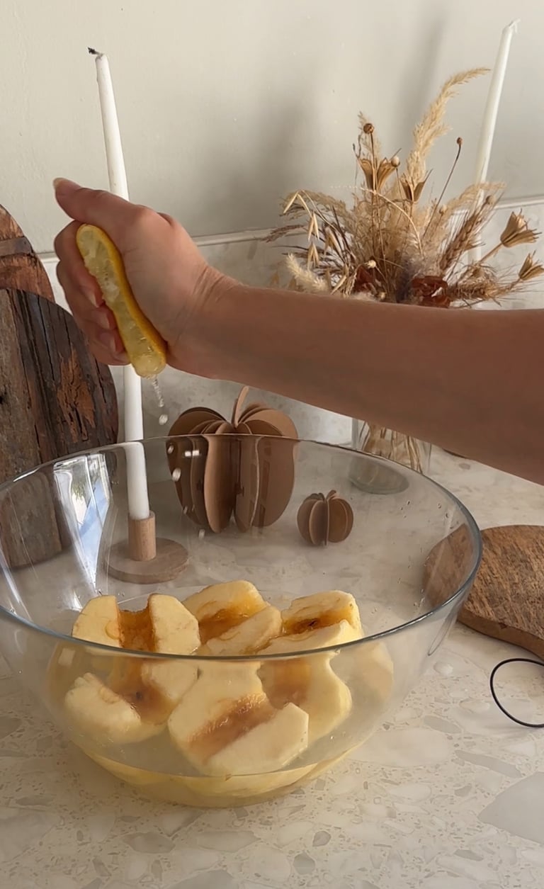 Ensuite on remplit un saladier d’eau et on vient y presser un demi citron. On vient y tremper les pommes. Ce mélange permet d’empêcher celles-ci de brunir !