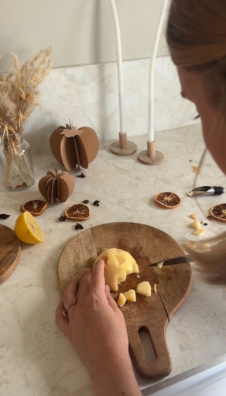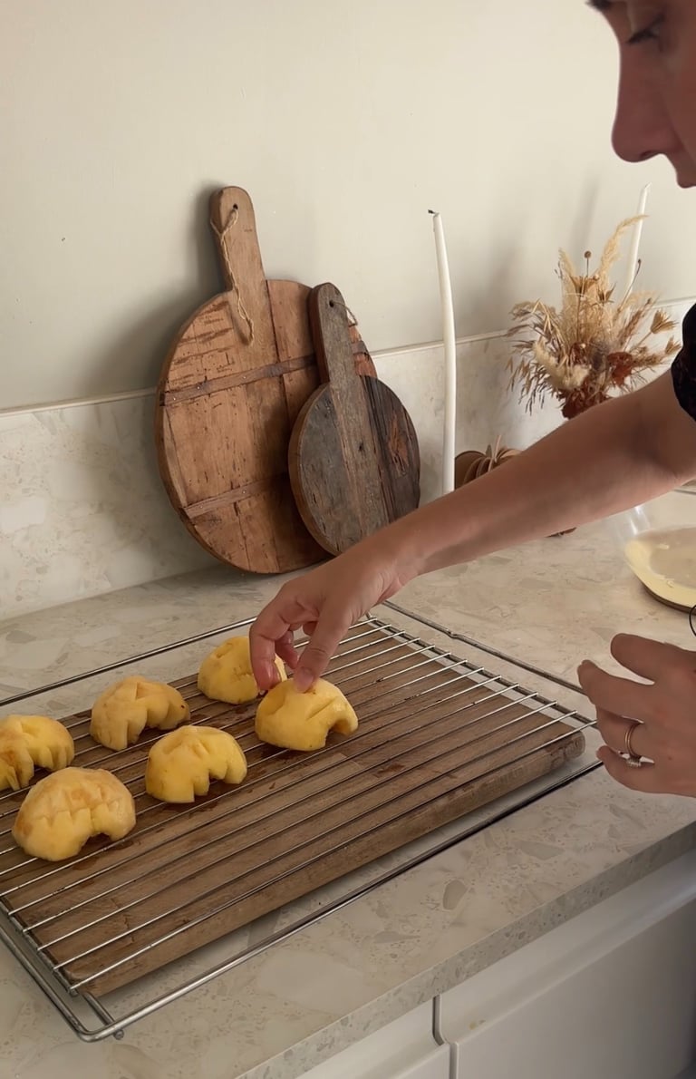 Ensuite à l’aide d’un couteau on vient dessiner des formes de tête de monstre dans les pommes.