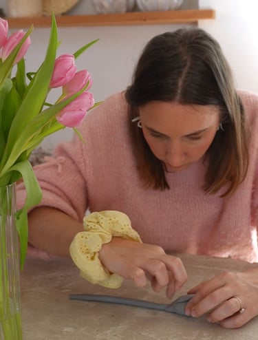 Je viens assembler les pétales un par un sur ma tige en fondant chaque pétale à la tige à l'aide de mon doigt, d'une petite éponge ou encore de ma cuillère ! Tous les moyens sont bons ! Je procède un pétale par un pétale jusqu'à avoir ajouter tous les pétales à mon travail. Ensuite je laisse sécher plusieurs jours jusqu'à ce que la pâte change entièrement de couleur.