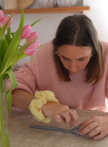 Avant de commencer je malaxe bien ma pâte, je la tape également sur mon plan de travail pour retirer les éventuelles bulles d'air. Ensuite, je commence par former des petites boules d'environs 3 cm de diamètre. Je vais venir les écraser à l'intérieur d'une cuillère afin de leur donner une forme de pétale. Je peux modeler jusqu'à ce que la forme me convienne. J'ai fait 5 pétales en tout !