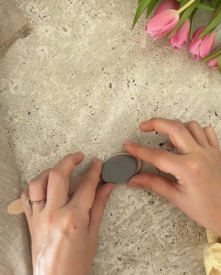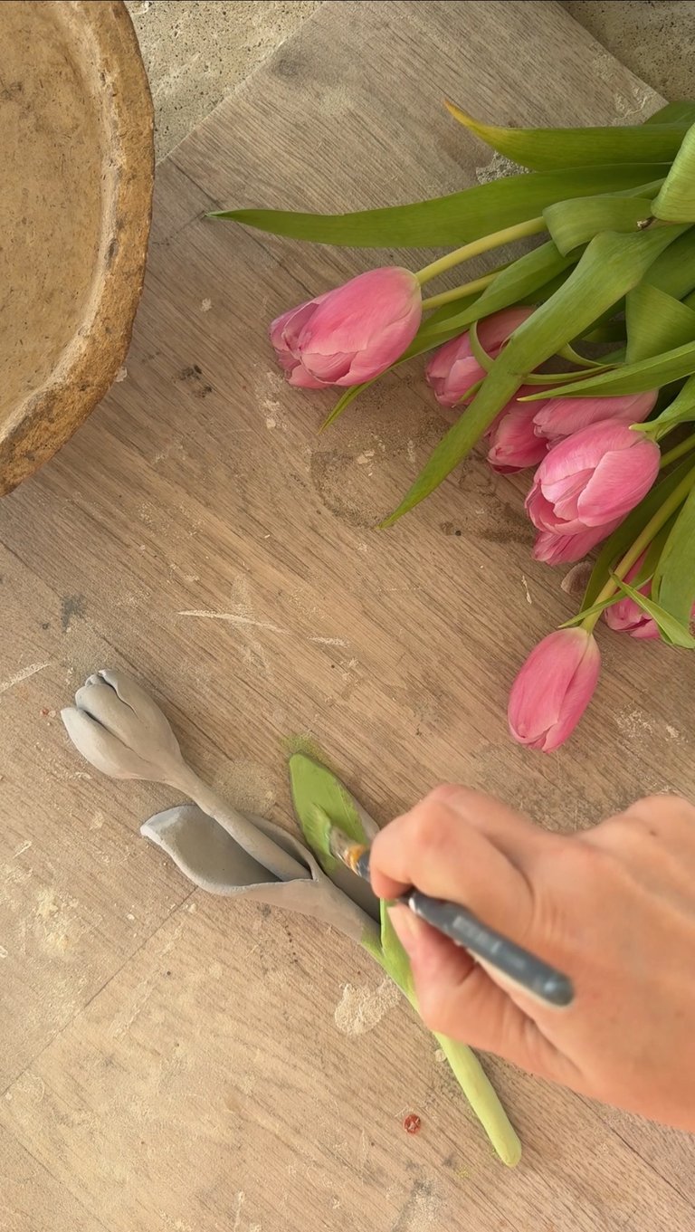 Avant de peindre je ponce légèrement les aspérités aux endroits où c'est nécessaire. J'utilise un grain fin comme du 120 par exemple. Ensuite je peux commencer à peindre avec de l'acrylique. J'ai choisi de faire les mélanges de couleurs moi même comme cela je peux faire de joli dégrader de couleur. Du vert clair au vert plus foncé pour la tige, du rose clair au rose plus foncé pour les pétales. Je préconise de dégrader en rajouter du blanc par petite touche plutôt que de tenter de fondre les couleurs avec de l'eau. En effet un excès d'eau ne serait pas idéal pour l'argile qui pourrait éventuellement se ramollir de nouveau.